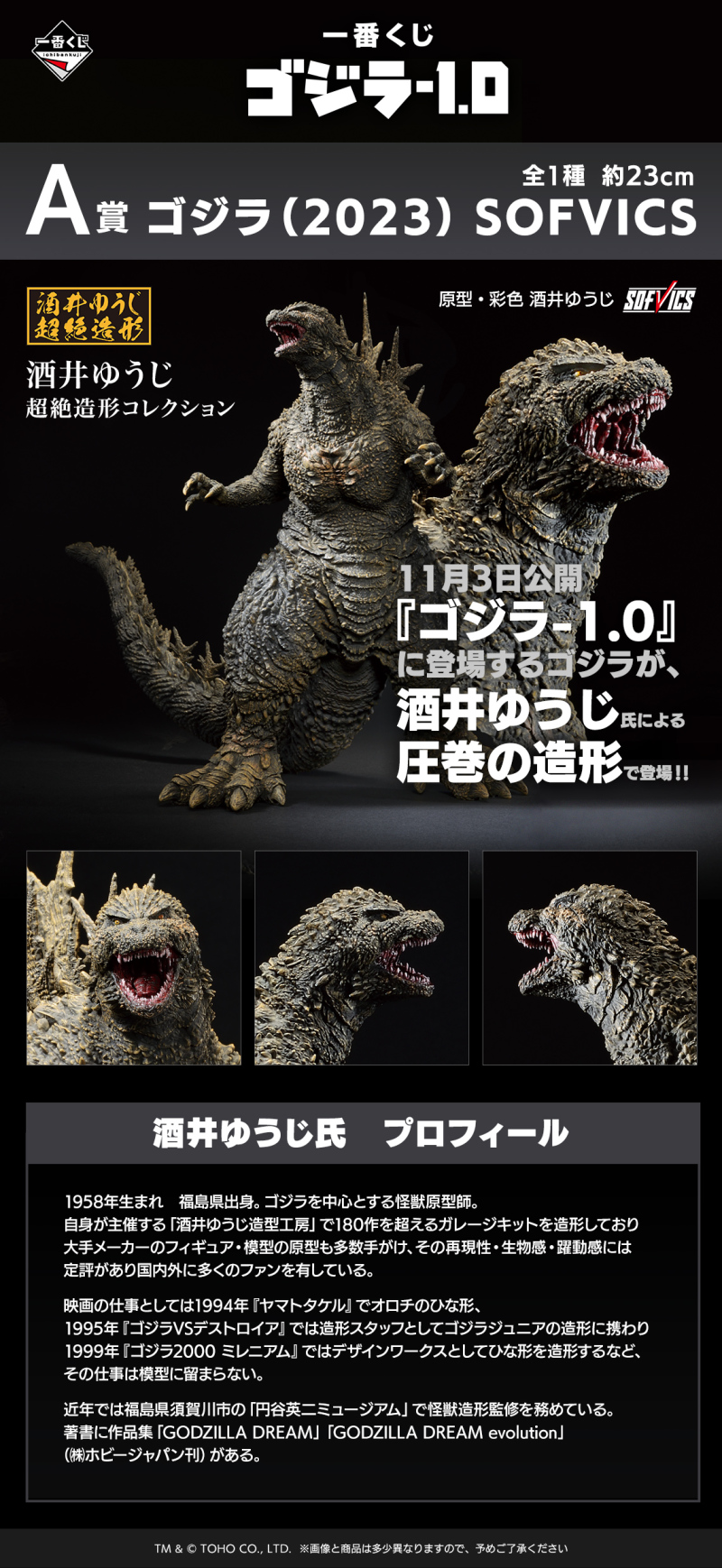 「一番賞 哥吉拉-1.0」,目前搶先公開精密造型的 A賞「SOFVICS 大軟膠 哥吉拉(2023)」,全高約 23 公分,由人氣怪獸造型作家酒井裕司(酒井 ゆうじ)擔任原型製作,粗糙皮膚、尖銳而巨大的背鰭都魄力再現!另外還有《哥吉拉-1.0》主題的盤子、馬克杯、紗布巾、壓克力立牌、電影標題 LOGO 展示牌、與怪獸頭像磁鐵等豐富賞品!最後賞更是「哥吉拉(2023) SOFVICS 熱線放射ver.」!