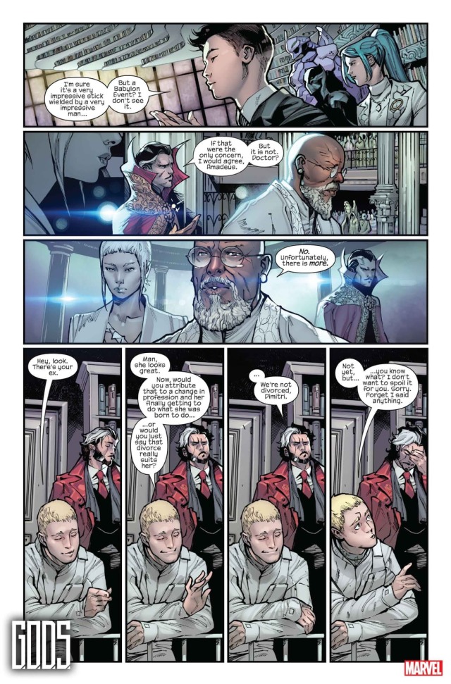 首先,一場科學與魔法交錯的集會在「世界圖書館」(The Library of Worlds)當中舉行著。我們可以看到畫面右半側明顯是以科學家為主——除了世上最聰明的「神奇先生(Mr. Fantastic)」和幾位A.I.M.成員以外,大部分人看起來也與科技相關。左側的人們不管是種族還是服裝上都奇幻了起來,更可以看到神奇先生的死對頭,科學與魔法雙修的「末日博士(Dr. Doom)」的現身。
