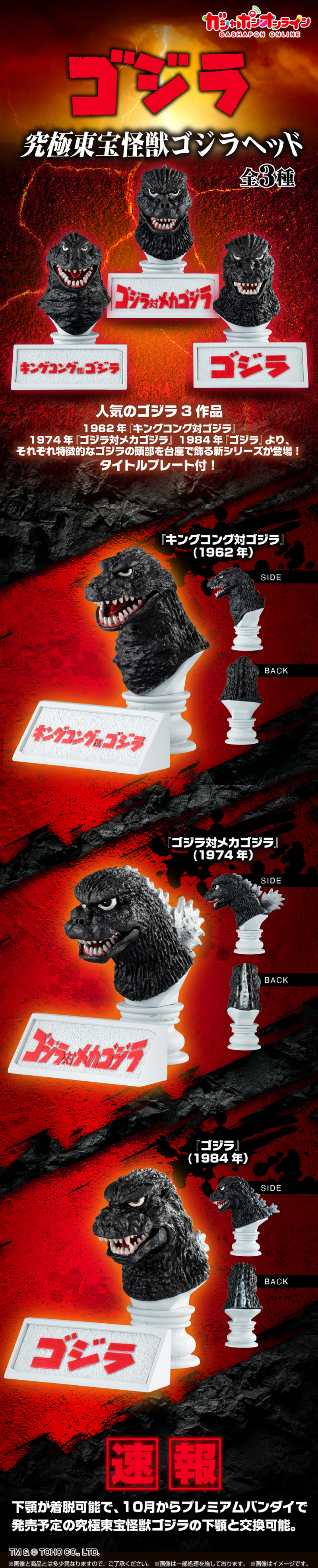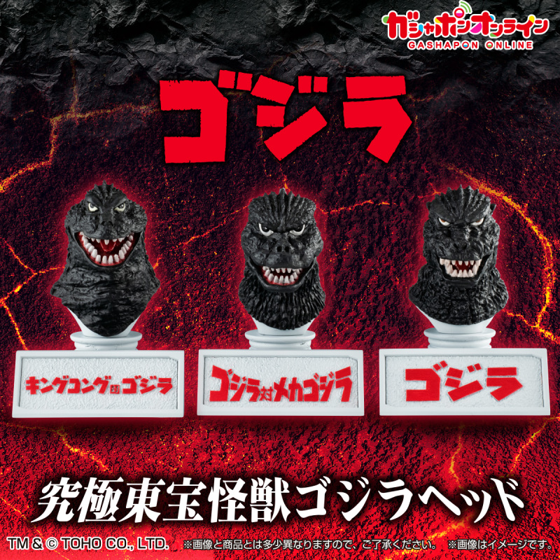 將不同時代的哥吉拉特徵頭部造型以約 6 公分小尺寸再現的新系列「究極東寶怪獸 哥吉拉頭像」收藏轉蛋,第一彈收錄有:1962年《金剛對哥吉拉》、1974年《哥吉拉對機械哥吉拉》、1984年《哥吉拉》三款頭像,除了精緻地刻畫出哥吉拉粗糙的膚質與尖銳背鰭等細節,歷代哥吉拉不同的眼神、頭部造型也忠實還原,每款皆搭配有電影的 LOGO 名牌,一字排開展示非常有氣氛!