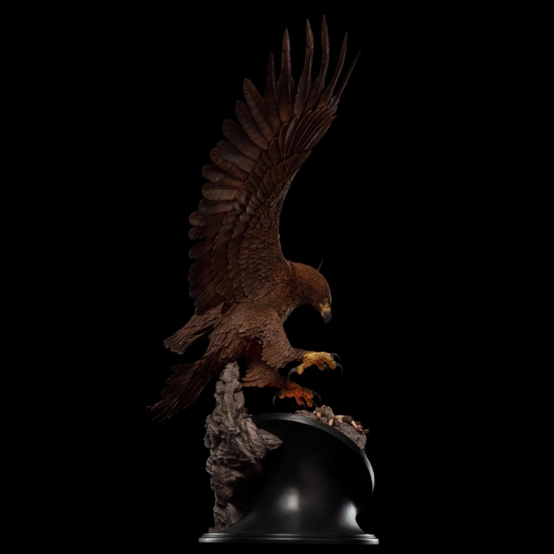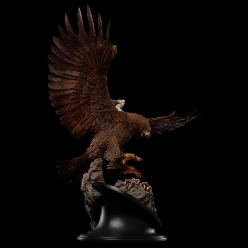 這次以 101 公分高度立體化的雕像充分再現了劇中讓人熱淚盈框的場面,體型巨大的關赫正準備抓起哈比人飛離此地,雙翼展開長度來到 119 公分相當驚人,全身羽毛的豐厚感、鳥喙與利爪的銳利度都有很棒的刻畫,並利用周遭的岩石讓關赫正在下降的動態感更為逼真,巨鷹背上甘道夫的白袍舞動感,以及佛羅多跟山姆衣衫襤褸、氣力放盡的狀態也仔細表現,岩漿更是在精緻塗裝與發光功能兩者交互作用下傳達出高熱、流動的視覺效果,真的是史詩級傑作。