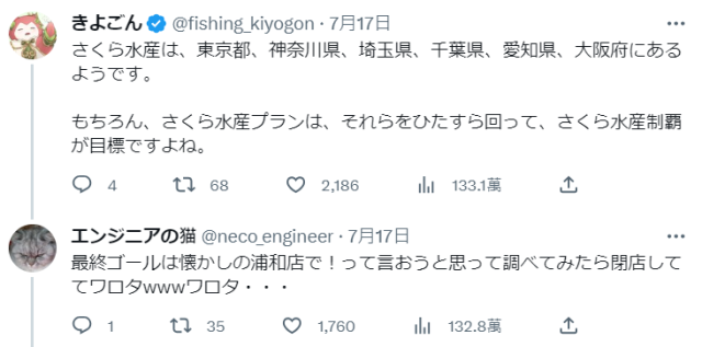 ▼網友:「櫻花水產在東京、神奈川、崎玉、千葉、愛知、大阪都有店。當然,櫻花水產計畫也可以是一口氣制霸上面那些目標呢。」