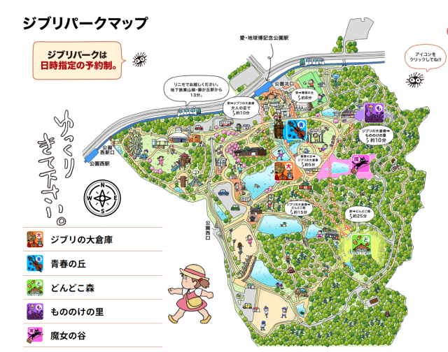 「吉卜力公園」是在愛知縣長久手市的愛·地球博記念公園園內興建,園區內目前設計包含 : 青春之丘區(青春の丘エリア)、吉卜力大倉庫區(ジブリの大倉庫エリア)、DonDoKo森林區(どんどこ森エリア)、魔法公主之里區(もののけの里エリア)、魔女之谷區(魔女の谷エリア)五個主題區域,以吉卜力工作室的經典動畫電影場景與設定打造。前三者已在去年 11 月正式開幕營運,後兩者仍在動工中。