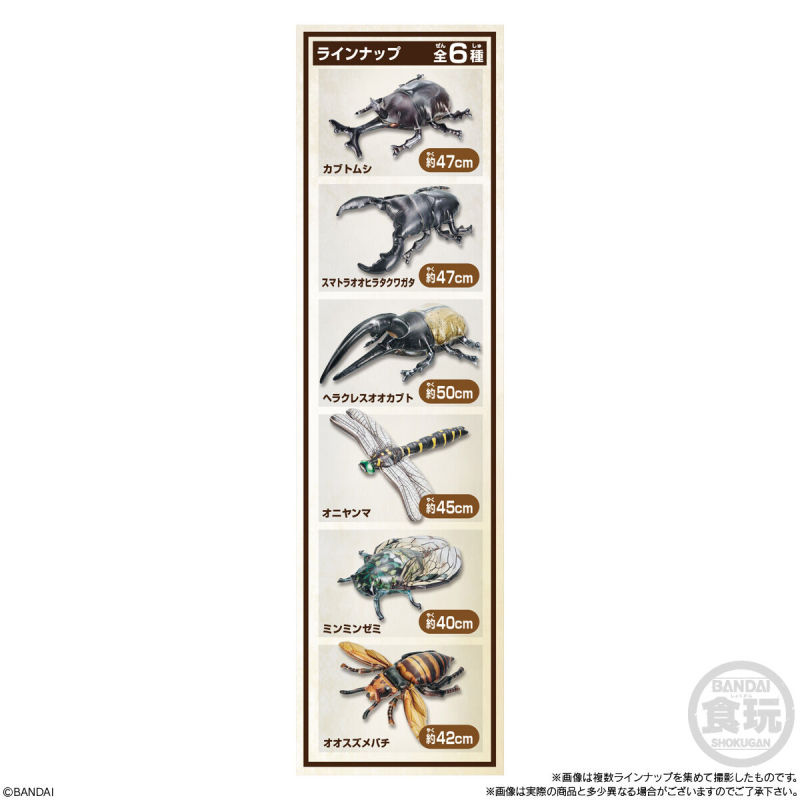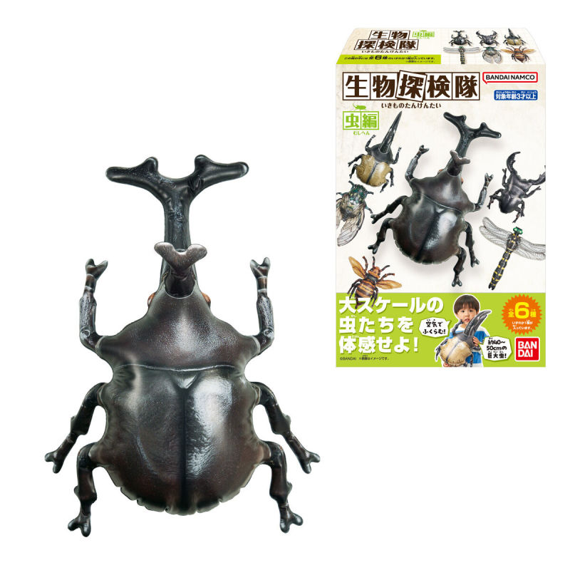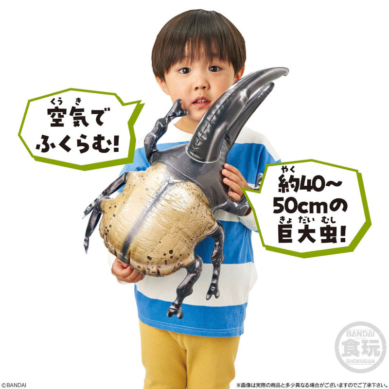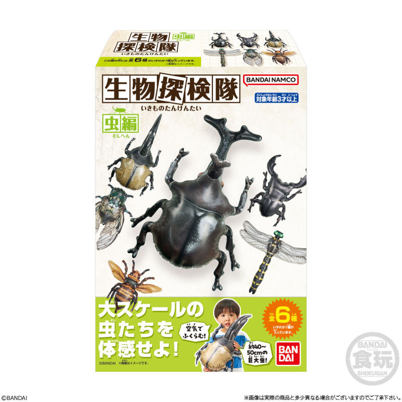 「生物探險隊~蟲編~」食玩,將人氣的蟲蟲化為大型充氣玩具,充氣後尺寸達 40 ~ 50 公分,收集前所未有的巨無霸蟲蟲!收錄有:獨角仙、扁鍬形蟲、赫克力士長戟大兜蟲、無霸勾蜓、斑透翅蟬和大虎頭蜂六種昆蟲,有別於充氣玩具給人較可愛、兒童向的印象,採用逼真風格的印刷,讓甲蟲甲殼的光澤質感、薄翅的紋理等都栩栩如生呈現!