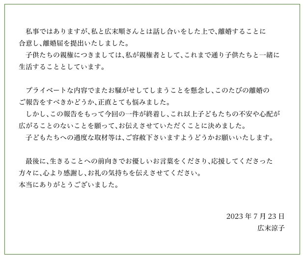 「雖然我確實顧慮到因為私事再度引起困擾,而由於是否應該對外公告與先生的離婚事宜,但為了結束這件事,且不再增加孩子們的擔憂,最終我還是選擇透過這一次的公告,來向外界聲明此事。」廣末涼子表示,希望再這件事情過後,媒體也盡量避免對孩子們進行過度採訪。