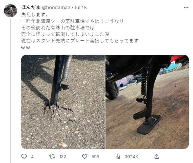 或許有騎重機的電電夥伴,最近這麼熱的天氣也可以注意類似的問題,希望別像這位推主一樣停車停到陷入柏油裡,真的會哭笑不得阿 QQ。