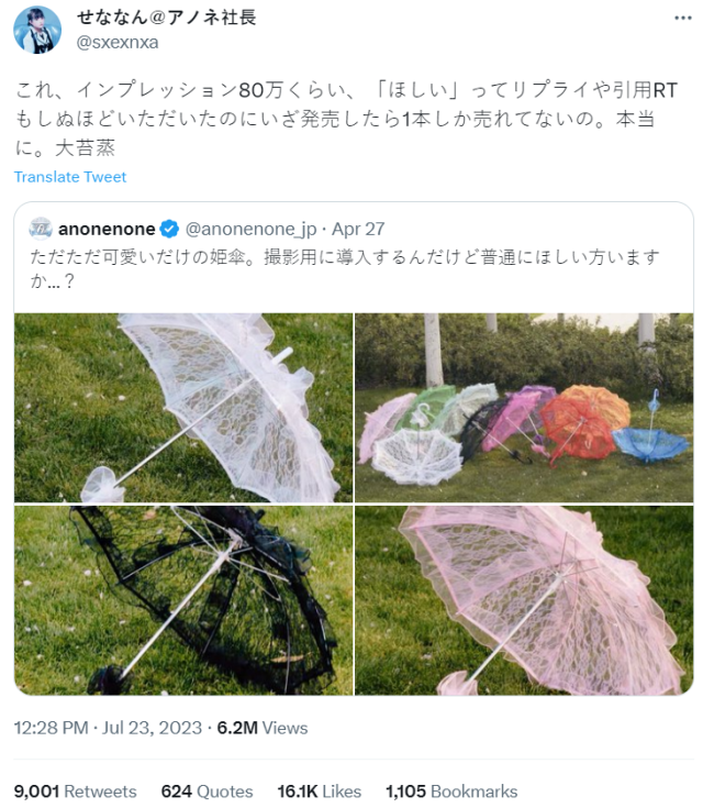 最近推特上有位賣家推主 ( @sxexnxa ),表示數個月前在推特上分享了自家商品「可愛的公主傘」,雖說光點擊就超過 80 萬以上,更有一堆人轉推留言表示很想要,卻在這數個月間...僅賣出 1 件商品,這件事情也讓他大嘆這個轉換率的低下,也成為推特網友話題。