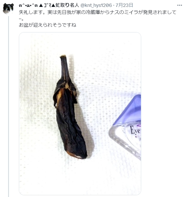 ▼「打擾了。其實前幾天我們家冰箱才發現茄子木乃伊。感覺可以直接迎接盂蘭盆節。」祖先們應該不會想騎這種茄子吧……