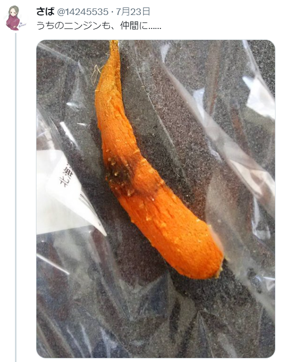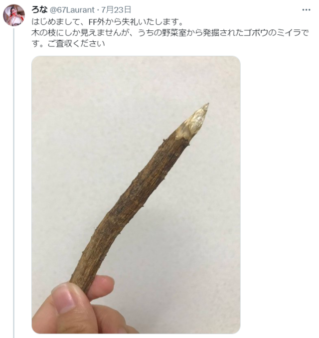 ▼「雖然看起來只是根木棍,但這是從蔬果室挖出來的牛蒡木乃伊。請查收。」還以為是蘆筍(?