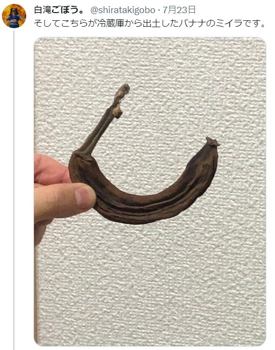 ▼「要搬家的時候在冰箱發現的香蕉木乃伊,請查收。」這已經都變黑色了耶……其他冰著的東西不會被影響嗎?