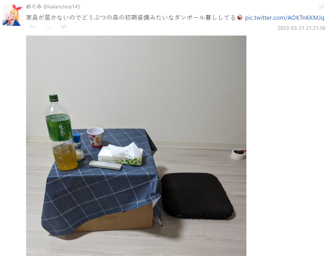 相信各位電電夥伴如果是在外工作的話,獨自生活的比例應該不少,一個人生活也好的地方也有比較孤寂的地方。最近日本推特上有推主分享了獨居生活三個月的樣貌,使用紙箱當作餐桌用餐,自嘲像是《動物森友會》剛開始玩一樣,這也引起了網友熱議。