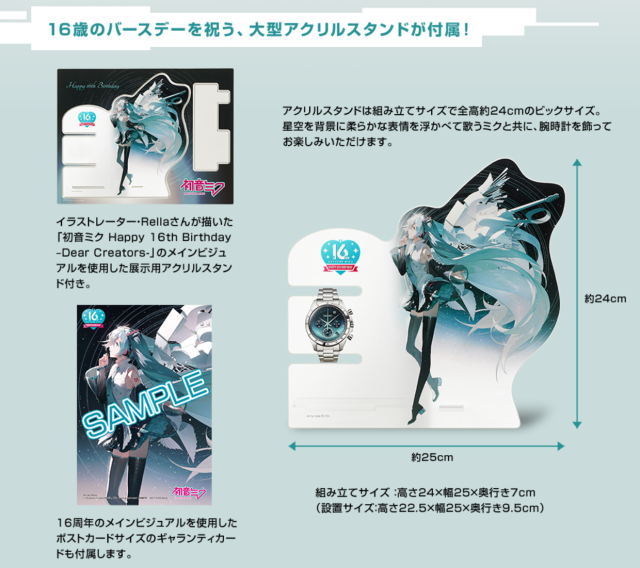 另外也將本次繪師- Rella 繪製的初音製作成大型壓克力立牌 & 收藏卡作為特典贈品,可以做為手錶展示使用,高 24 公分寬 25 公分的大小,擺放在家中展示非常適合。