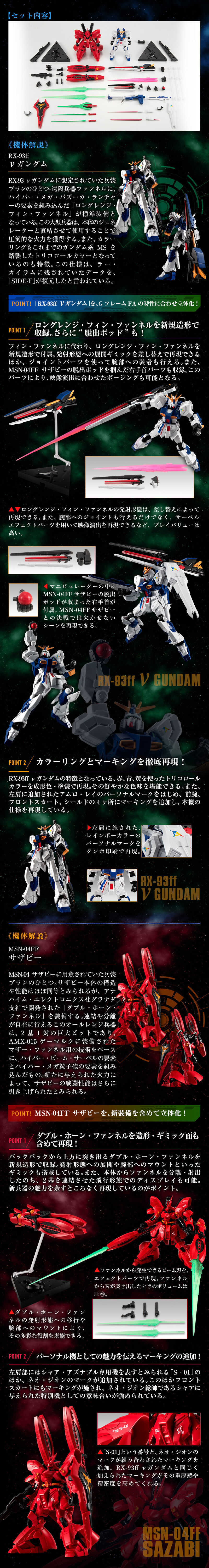 於 LaLaport 福岡購物中心前廣場實物大展出的「RX-93 ffν鋼彈」以及在現場特別影片演出的「MSN-04FF 沙薩比」,將在機動戰士鋼彈 G-FRAME FA系列以限定套組再登場!使用豪華規格打造,在約 11 公分的小尺寸中再現福岡實物大立像與宣傳影片中的形象,並附有新規零件製作的「遠程翼狀感應砲」、「雙管感應炮」新武裝,以及沙薩比的逃生艙!另外還有感應砲、光束步槍、光束軍刀、盾牌和替換手勢等配件,能夠賞玩特別影片中的兩機戰鬥場面。