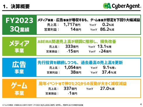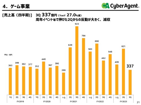 由於 CyberAgent 本體是一家網路公司,遊戲事業部僅是其中一環,可以看到廣告事業上仍讓他們在本季度整體收益為正,並無須擔心。