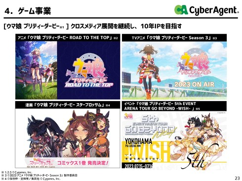 雖說這是兩年多來的首次赤字,但社長藤田晉仍保持樂觀,認為今年播出的網路外傳動畫《賽馬娘Road to the Top》 以及遊戲《賽馬娘 Pretty Derby 熱血喧鬧大感謝祭!》也將在 2024 年上市,都有良好的市場反應,相信之後的遊戲事業前景。