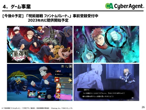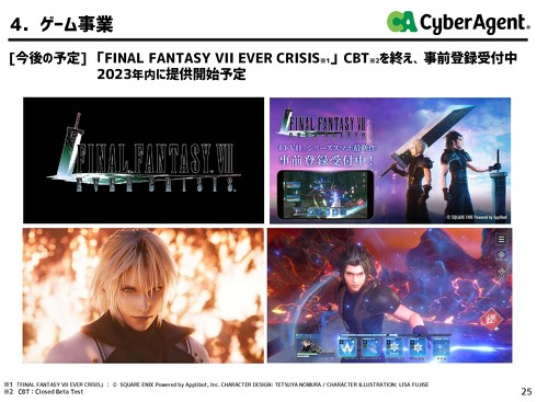 此外,開發的手遊《Final Fantasy VII Ever Crisis》與《咒術迴戰 幻影遊行》也都正在事前登錄邀請玩家中,今年度預定會正式上線,遊戲事業仍保有很富足的潛力。