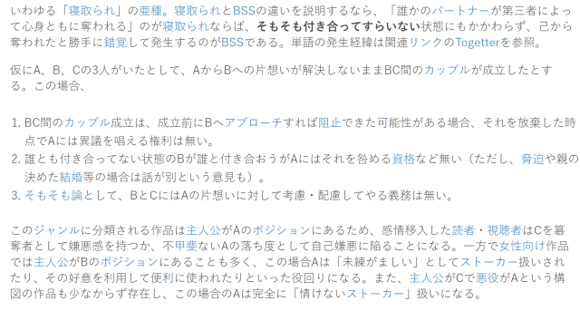 雖說像大百科這種內容就像維基百科一樣可以任人編輯,但對於「BSS」一詞的介紹,其實就是「明明是我先喜歡的」( 僕が先に好きだったのに ) 的縮寫,而裏面介紹是指「連擂台也沒站上去的輸家所說的蠢話。」,直接有力讓網友感到殺傷力之高。簡單來說就是根本連戰的能耐都沒有,才會喊出這句台詞,這也因應在許多 ACG 角色的處境。