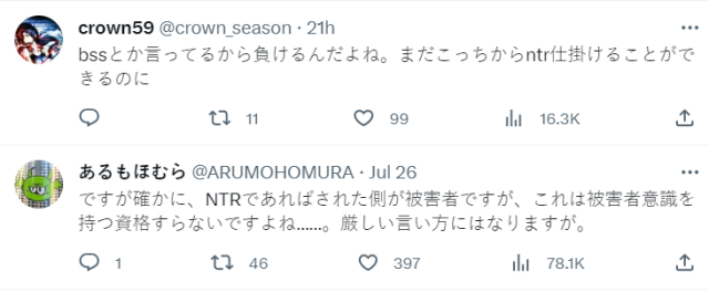 不過這也有鑒於不少日本網友認為近來「NTR」一詞有被濫用的情況,才會衍生出「BSS」這一個詞彙,希望確立這兩者之間的差異。