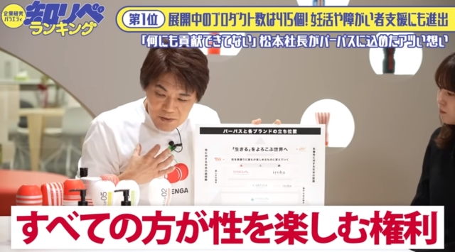 社長在節目中也拿出了TENGA系列品牌的定位圖表,表示TENGA最大的展望是「打造一個充滿愛和自由、任何人都能自由說出自己的喜好、而且彼此都能互相認可的世界」,當然同時任何人都有享受性的權利。