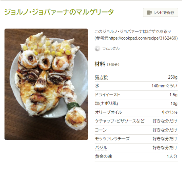 不過作者有把食譜和製作方法給上傳到網上,將麵團「無駄無駄」然後「WRYYY!!!」接著用巧克力醬和番茄醬當基底,另外會加巧克力醬是因為巧克力是喬魯諾喜歡的食物之一所以加上去了,然後放上一些喜歡的料後烤一烤就完成了!