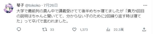 ▼「我大學的時候曾經坐在最前面的正中間,只是後半幾乎都在睡,畢業的時候被說『你第一次的時候都會認真聽,但為了那些聽不懂的人重講第二遍的時候就會睡著。』」