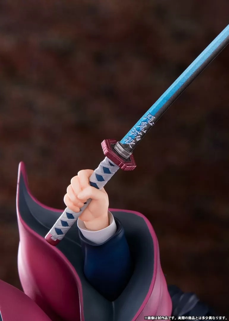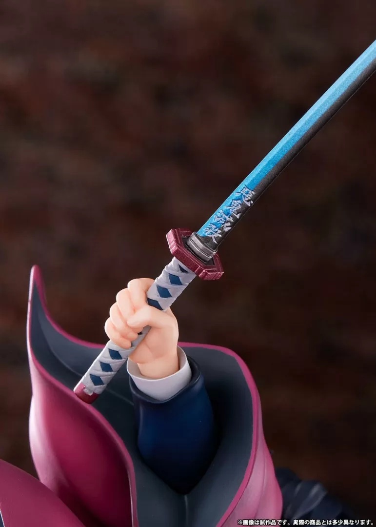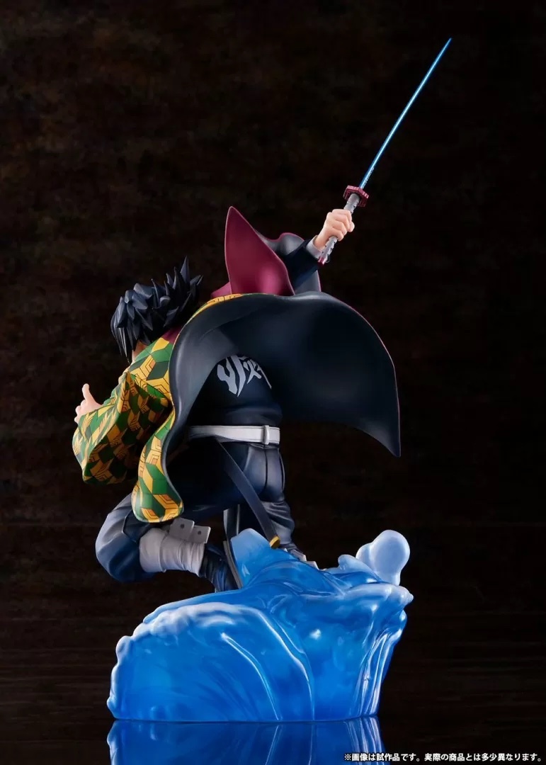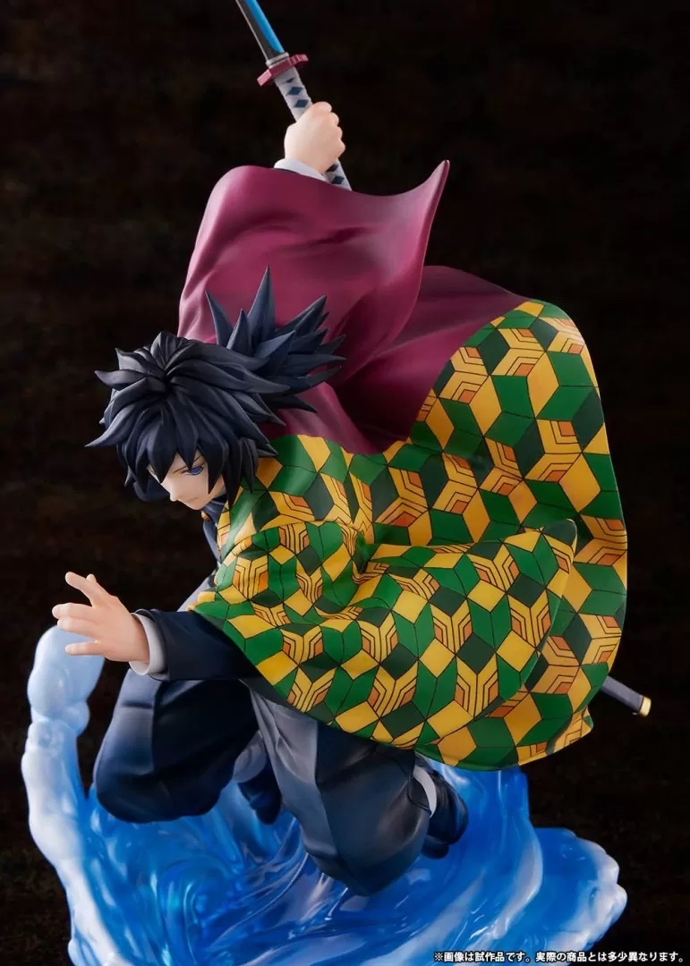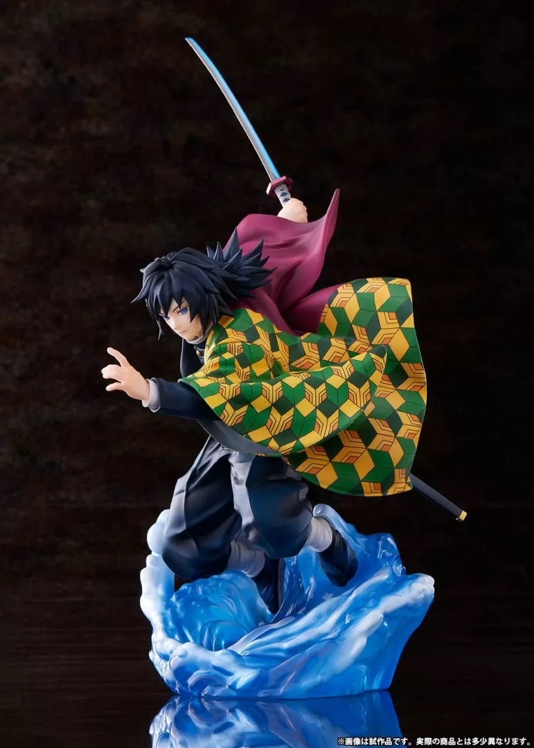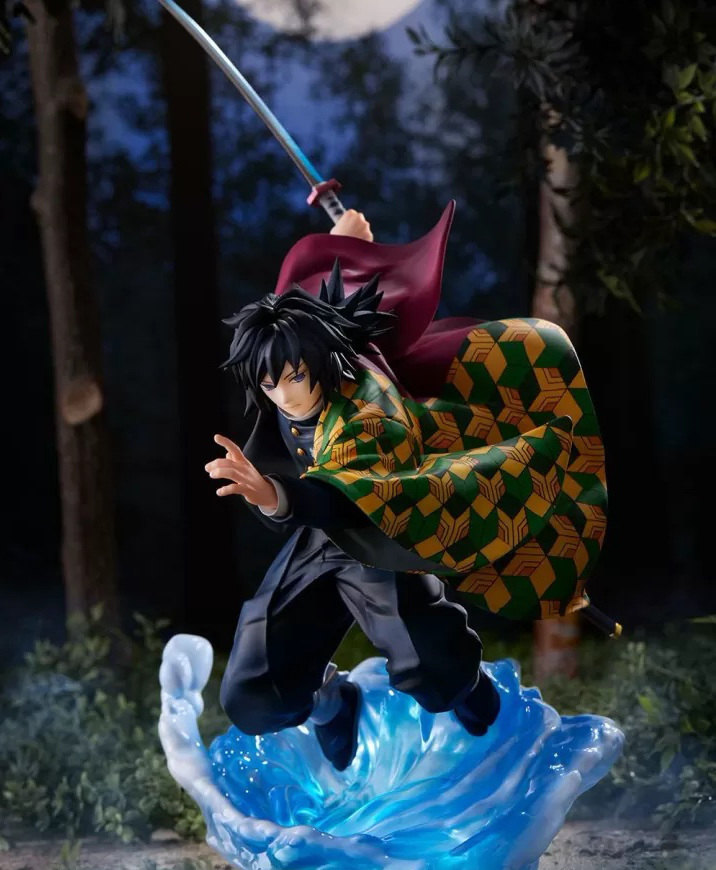 這款由Bellfine所推出的富岡義勇,以1/8比例製作,全高約為27.5公分,以富岡義勇使出水之呼吸出招的模樣為外型實體化,腳底下所踩著的底座,則是做成以水之呼吸效果的波浪造型。義勇身上的標準外觀,就是他左右花色不同的羽織,右手持著他的日輪刀,在刀的底部還刻著「惡鬼滅殺」的字樣,表情依舊是一號表情,衣服上的細節,也一一仔細還原。