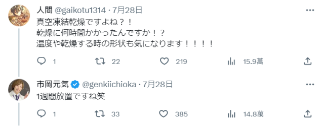 ▼網友好奇用的是什麼乾燥法、花了多久時間乾燥、溫度和乾燥時的形狀也很讓人在意。不過市岡元気只簡單說放了一個禮拜。