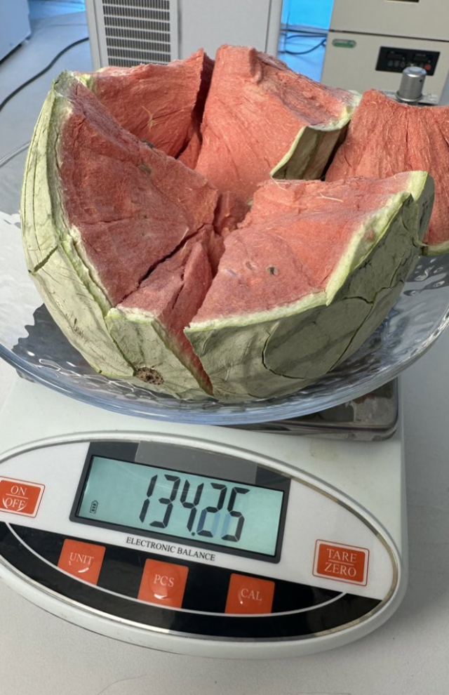 從圖片中可以看到原先的西瓜重達1777.52克,等於水分佔了全部的92%多!這個比例跟大家想像的比起來是多還是少呢?