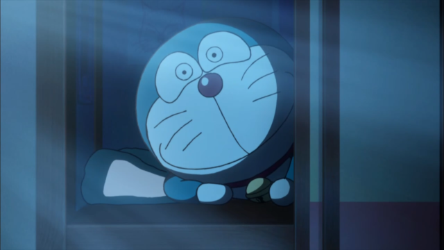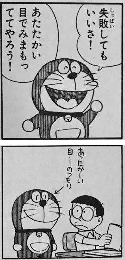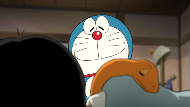 為此感到欣慰的哆啦A夢則選擇在一旁使用「關愛的眼神」默默看著他,只是他一開始不知道什麼是關愛的眼神,在各種表情之間猶豫了一下,所以才會有這個眼神多變的瞬間。