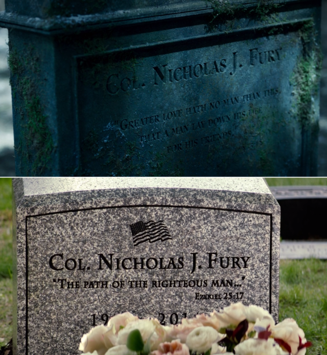在墓園中,福瑞把「收成」藏在一座自己的墓碑裡,也說自己在世界各地都有墓碑。而我們在《美國隊長:酷寒戰士》結尾,就看到福瑞為自己立了一座假死的墓碑。