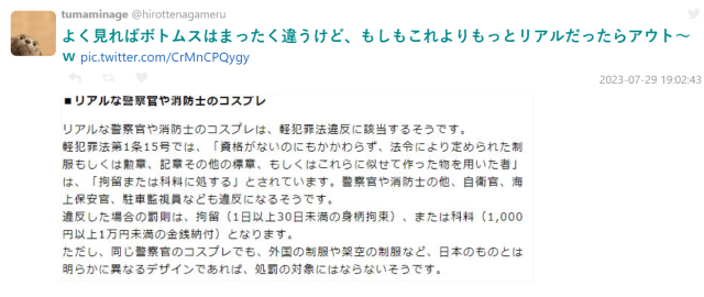 不過像警察甚至是軍人的裝扮,不僅在台灣連日本也是不能擅自使用的,有法律上的規範,雖說這並非完全一致的樣式,但如果造成混淆或是破壞印象,都有可能被關切。