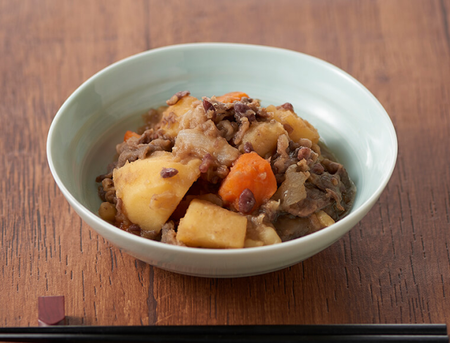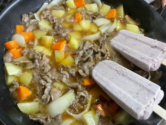 「紅豆冰棒+洋蔥煮牛肉」( あずきバーで肉じゃが ) 是井村屋提供食譜裡面最未為人知的,把冰棒投入到煮得熱呼呼的牛肉裡面,融化之後成為調味以外,更可以煮出來的料理中吃到紅豆的顆粒,這樣的作法的確是別出心裁。
