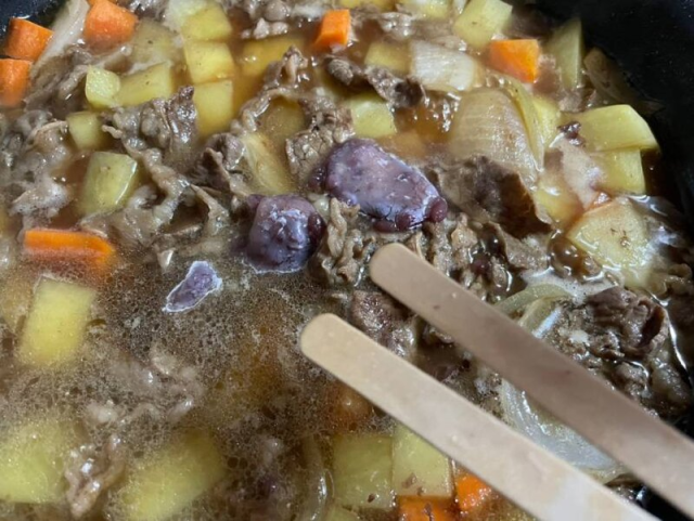 以牛肉 100 克,加上半顆洋蔥、半條胡蘿蔔、以及兩顆馬鈴薯開始料理,將鍋中油熱好後把洋蔥與牛肉先行投入,之後再放進切丁的馬鈴薯與胡蘿蔔。