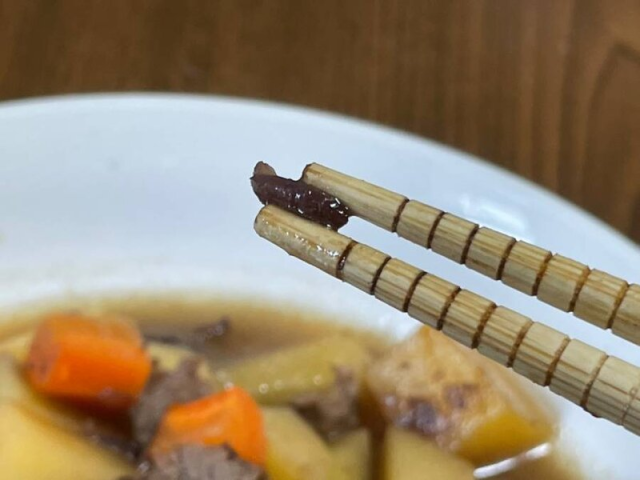 嘗試之後的口味其實出乎意料的好,紅豆冰棒的甜味搭配洋蔥本來就有的甜味很契合,原先的牛肉與馬鈴薯也不會因此而失去好滋味,反而因為溫潤的甜味吃起來滿不賴的。