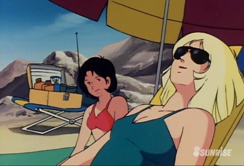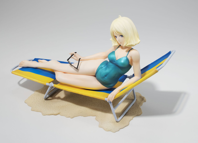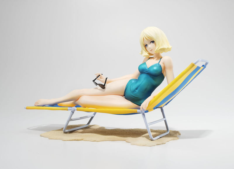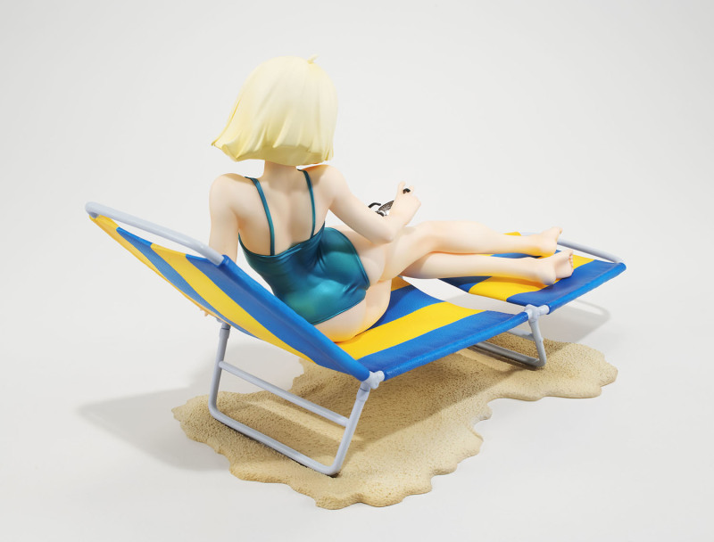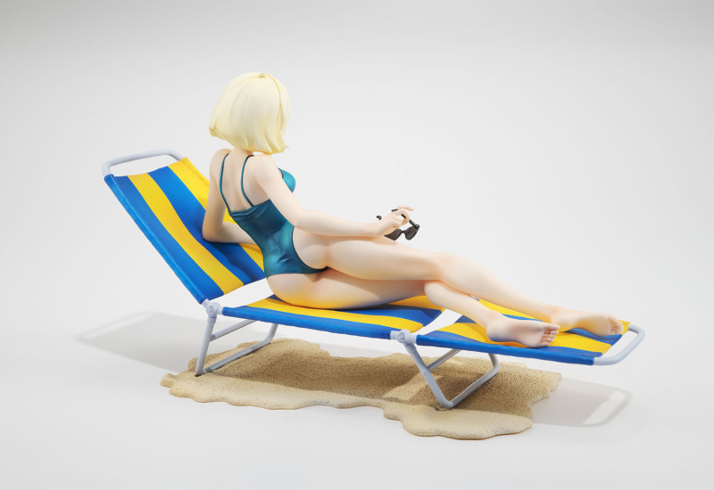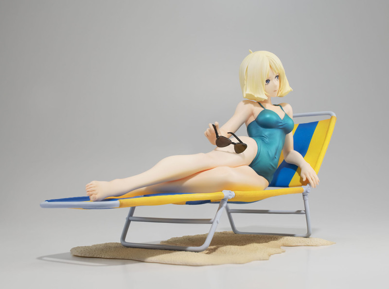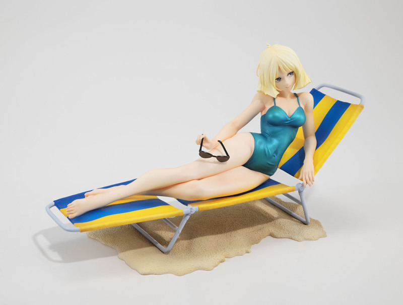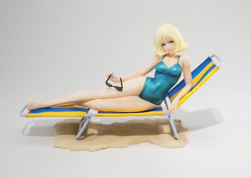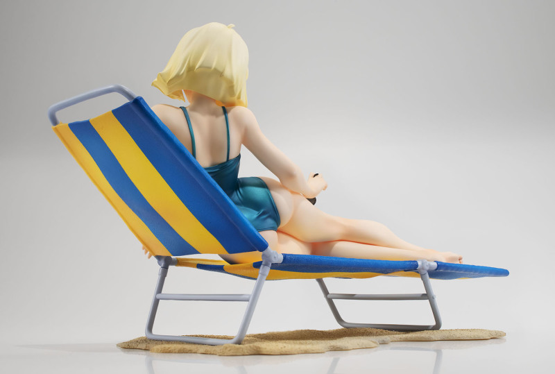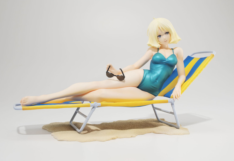 這次 GGG 系列再度將初代《機動戰士鋼彈》中「紅色彗星」夏亞・阿茲納布爾的親妹妹昂有著亮麗金色短髮的美女雪拉·瑪斯立體化,造型來自當年動畫第 13 集中短暫出現的綠色連身泳裝造型,戴著時尚的太陽眼鏡躺在沙灘躺椅上曬日光浴,這樣的「殺必死」場景以現代眼光來看可能會覺得阿罵才穿這種樸素泳裝,但在 40 多年前可是標準的海灘美女形象。
