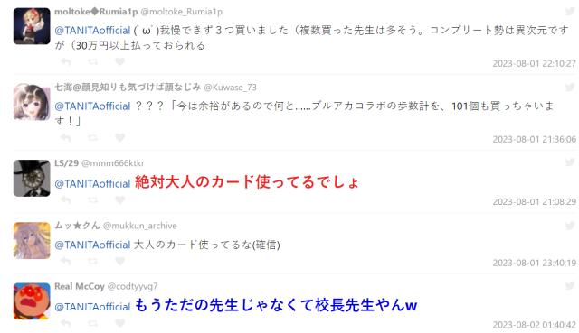 其實 TANITA 過去就與《蔚藍檔案》合作過,推出人氣角色早瀨優香(早瀬ユウカ)的體重計。這次是小型的配戴型「健康感應計步器 」,一次把 101 位角色都搬出來,雖說原本應該是給老師能想買到自己喜歡的角色,結果意外發現老師們都是超級 DD ( ? ),爆買一波掃貨連 TANITA 官方都感到可怕。