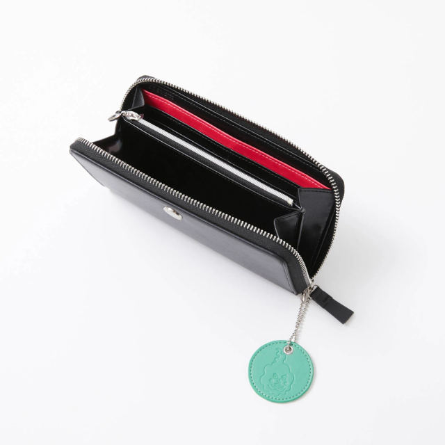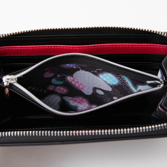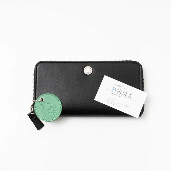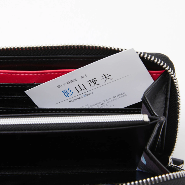同樣以漆黑的外觀為基礎,旁邊附有上級惡靈「小酒窩」 的皮製吊飾,打開後有著紅色的點綴不讓整體無趣,拉鍊夾層開啟也有特製的滿版內襯。另外附有靈能相談所的名片。