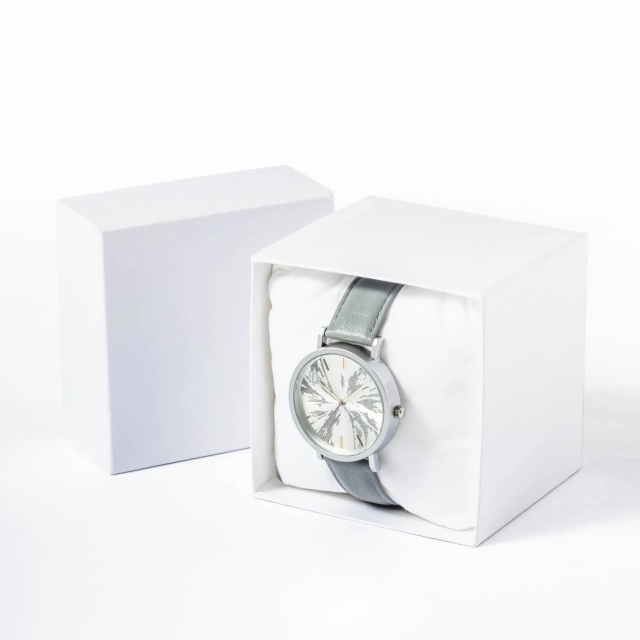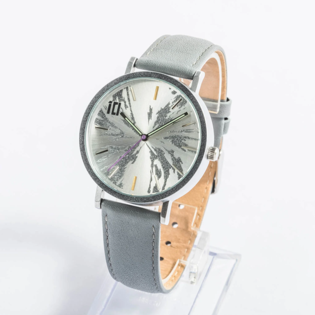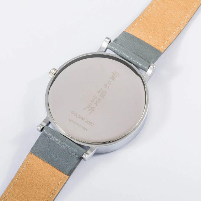 在 10 點鐘位置特別顯示為黑色,搭配整體錶面銀色光芒的效果,錶背附有文字「靈能力相談所」,整體以靈幻新隆服裝的銀灰色為基礎,算是較為高調亮眼的設計。