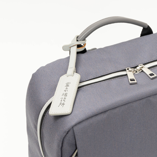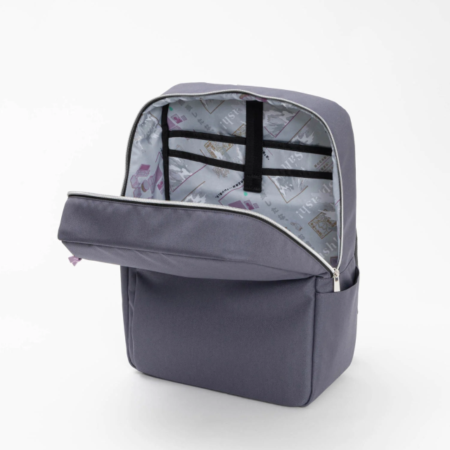 同樣以銀灰色為基礎,背包本體前方有個獨立收納空間,附有「靈能力相談所 」的皮製裝飾,打開內裡也有滿版的圖案讓整體不顯得單調。