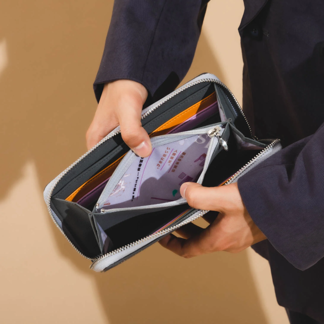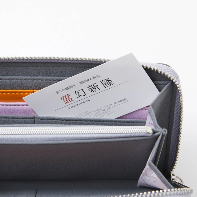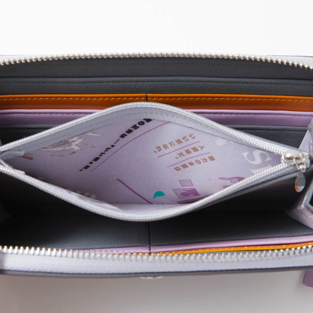 同樣以銀灰色的外觀為基礎,打開後有著橘色與粉紫色的點綴不讓整體無趣,拉鍊夾層開啟也有特製的滿版內襯。另外附有靈能相談所的名片。