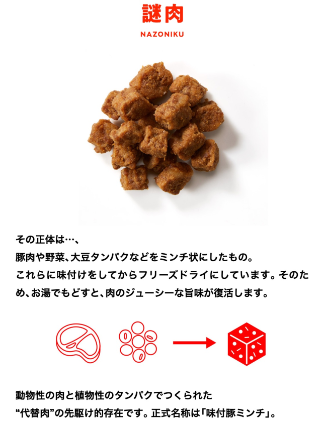 日本知名食品企業「日清」向來以他們引以為傲的「速食杯麵」以及「無厘頭」聞名,日本幾乎各大超商、賣場皆能看到日清的影子,而那白色杯裝的杯麵也成為他們的招牌「美食」。不過日清的杯麵到底好吃在哪呢?首先得先知道其中一個內容物「謎肉」,這是日清杯麵裡的一塊塊茶色四方形的乾燥肉塊,但正如其名,「謎肉」的成分究竟是什麼肉?別擔心,請「科學」幫忙解答。
