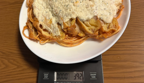 那來看看不少人正餐會選擇的「塔塔醬炸雞炒麵」,來看看到底會不會又讓人感到震驚,沒想到不得了,通常版才 206 g,增量版直接到 392 g,增幅約 90% 的超狂數字,連部落客「ゲムぼく。」都直呼 : 「這根本是罪惡的根源 ! 」