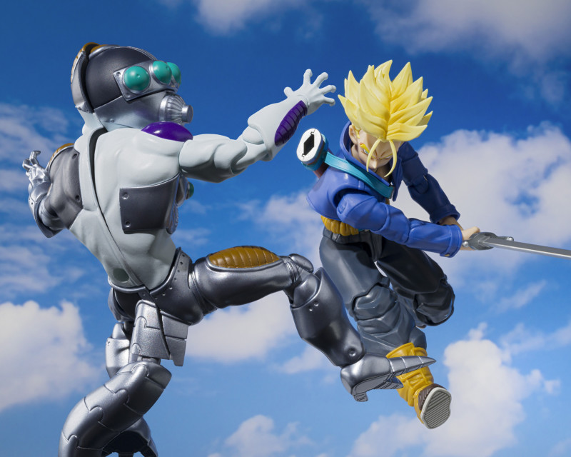 「S.H.Figuarts 機械弗利沙」可動人偶,尺寸全高約 12 公分,仔細再現機械弗利沙令人印象深刻的拼裝造型,半機械的臉部與義肢施以金屬塗裝,頭部和胸前的傷痕也有表現出來。附有自信笑臉、咬牙臉、吶喊臉、邪笑臉以及被斬成兩半的替換表情零件!另外還有全身被斬斷的替換軀幹,重現對上未來特南克斯大劍的激烈場面~
