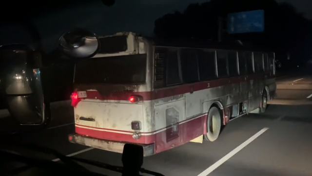 推主竜胆かるぴす(@rindocalpis)在路上遇到了一輛破舊且完全沒開燈的公車在深夜的路上奔馳,不知道要去往哪裡。