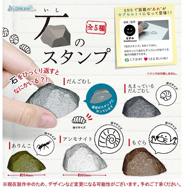 擅長發想各種創意設計日本的創作者 ミチル (@mitiruxxx),在各人推特上發表了看似無用小石頭的「石頭印章」,結合鼠婦、團子蟲喜歡躲在石頭底下的習性,將石頭底部設計為可以印出可愛小圖樣的印章,引起共鳴~由 J.DREAM 將其設計轉蛋化,以約 6 公分的尺寸將作品重現,並收錄了:團子蟲、捲起來的團子蟲、螞蟻、菊石、鼴鼠等不同的印章圖案~重溫童年翻開石頭找蟲蟲的樂趣!