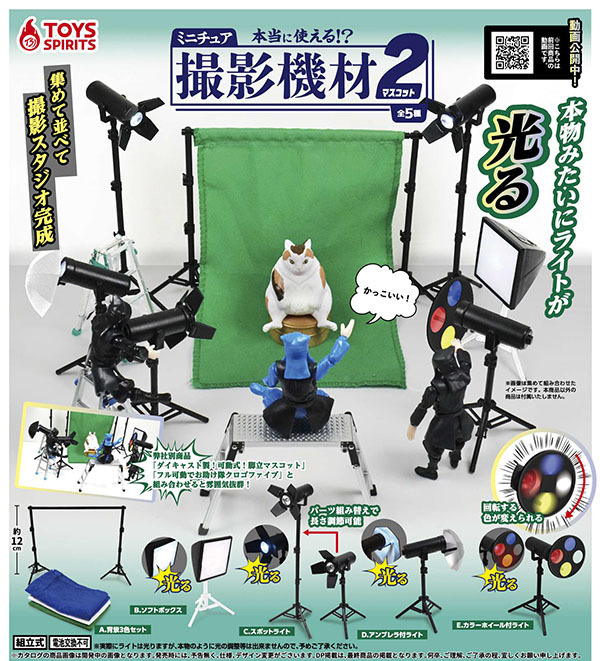 「真的可以用!?微型攝影器材2」轉蛋延續前作的概念,以約 10 公分的小尺寸呈現出玩具的迷你攝影棚,收錄有:三色背景架,可以依據拍攝的玩具主體的顏色來選擇替換藍、綠、白三色的背景布幕。另外就是本系列(物理上)的亮點—棚燈,共有白色支架的柔光箱、可以伸縮高度的聚光燈、傘燈,以及本次新登場的四色色片燈!除了每一款都是內藏有微型燈、真的可以打光,色片燈更是有旋轉換色片的可動設計~追加了更多玩法!