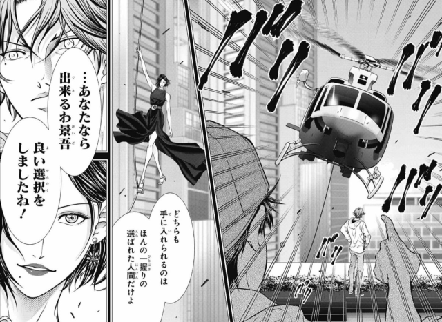 本回的「跡部媽媽」跡部瑛子,雖說 45 歲的設定,以短髮又貴氣的穿著登場,還拉著繩子懸在直升機外,這個潮度...果然是冰帝貴族風範的母親 XD。
