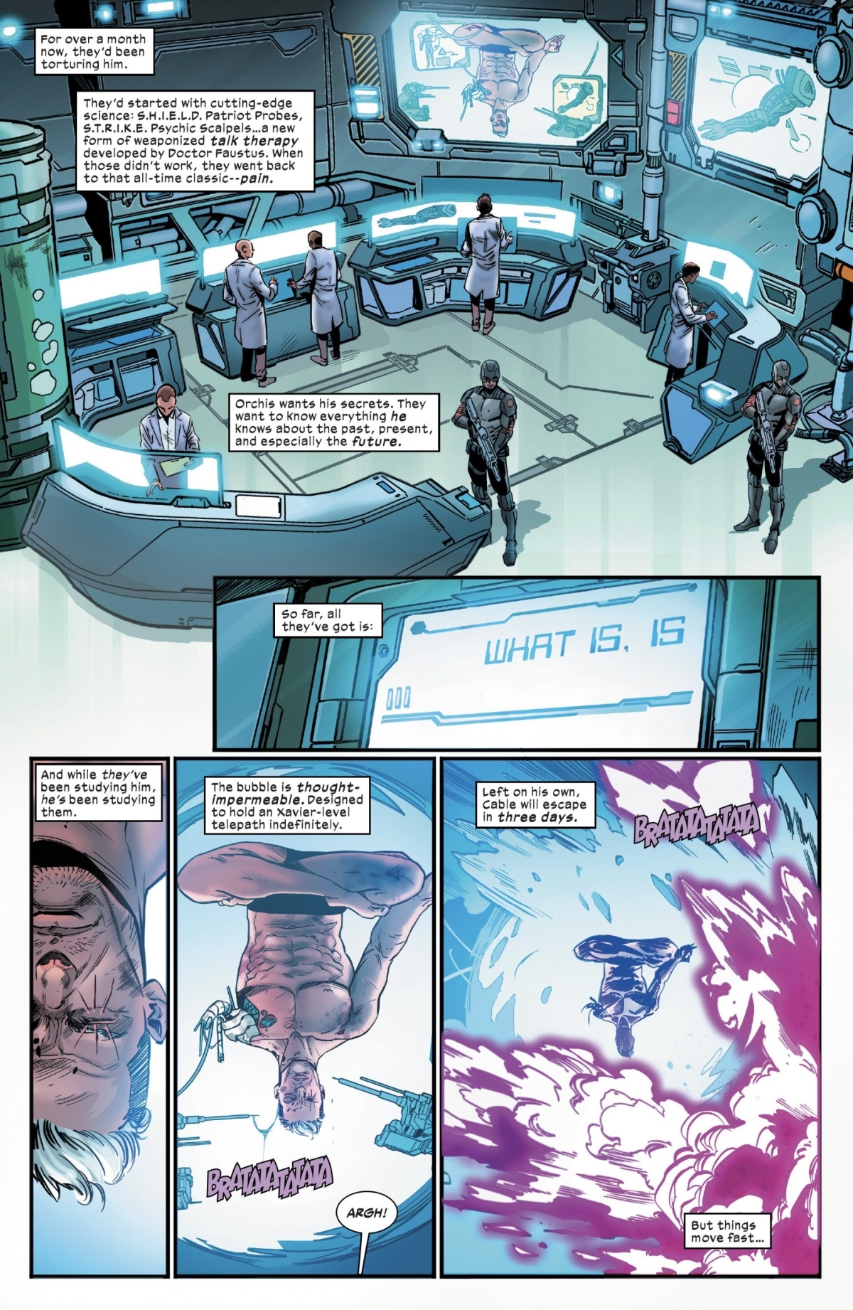 但是在帶到那之前,鏡頭要先轉到這個故事的主角變種人「鎖鏈(Cable)」身上。他早先遭到紅蘭局突襲並被抓進了一間研究設施中,好從他身上審問出有關於未來的資訊。但是他幾乎可是全時間線上最驍勇善戰的戰士,這種審問對他來說並不是什麼大事。過個幾天,他甚至能自行逃脫。