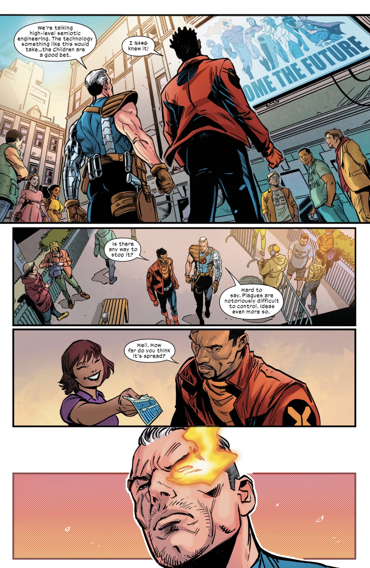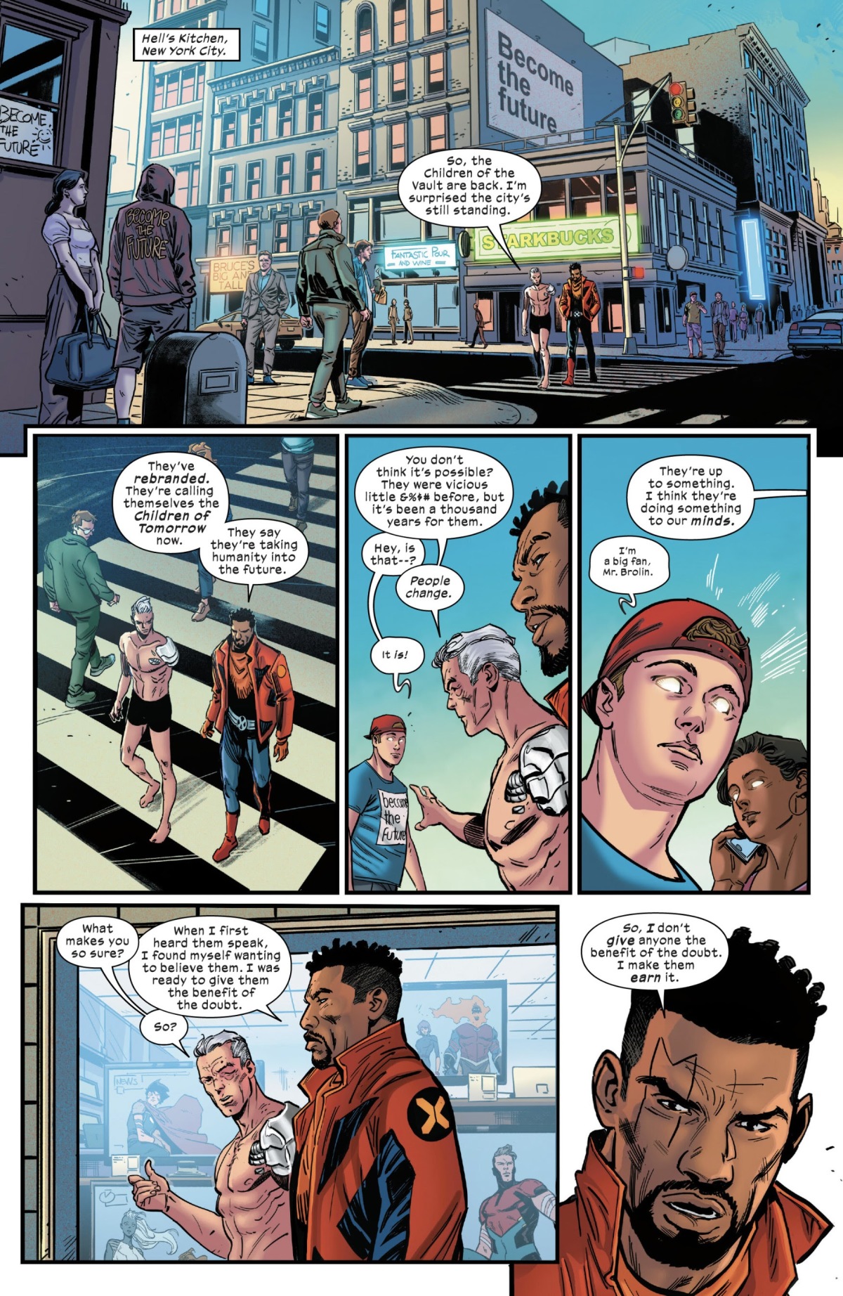不過幾個星期,全世界都染上了「成為未來」的標語。兩位來自未來的變種人戰士打算到鎖鏈的安全屋重新整裝,途中他用能力讓路人認不出他們是誰,結果路人以為他是喬許‧布洛林XDD