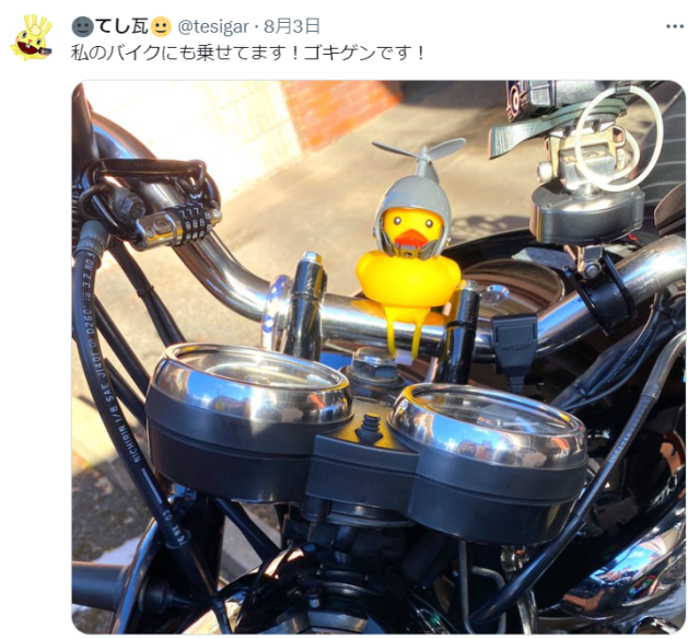 一名推主ちり紙(@tole_pe)那天看到同事的摩托車上綁了一隻戴竹蜻蜓安全帽的鴨鴨玩偶,用LINE跟對方說很可愛之後,對方竟說:「我幫你買一隻啊!」