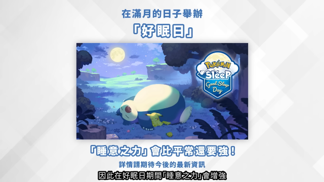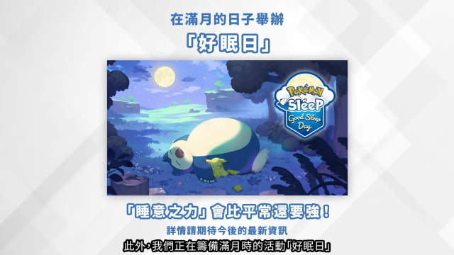 「睡眠遊戲」《Pokémon Sleep》,在上架於Android、iOS雙平台一個月後,也在「Pokémon Presents 」直播發表會中,宣布推出第一個活動「好眠日」。